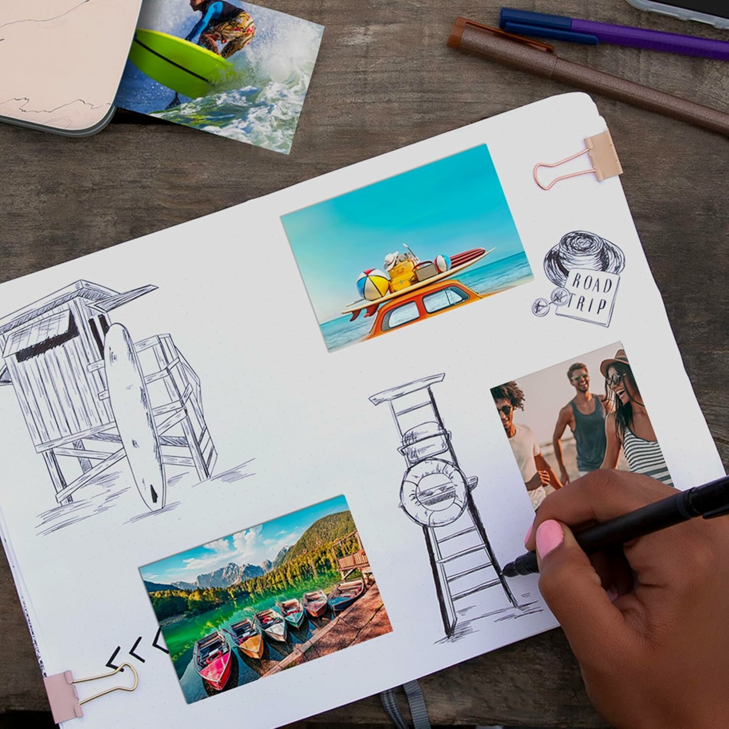 - Includes HP Zink photo paper – Load the 10 sheets of HP ZINK 2.3×3.4″ sticky-backed paper into your portable picture printer and create smudge-proof photos and stickers for journaling for your creative projects